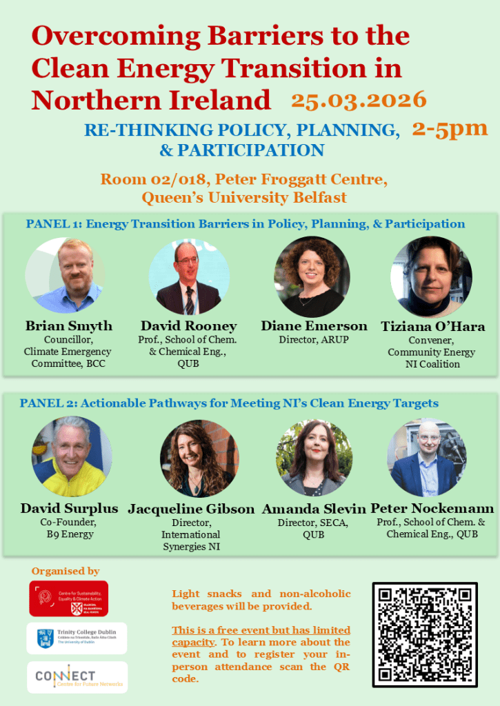 Organised by Dr. Dipali Mathur in collaboration with Prof. John Barry, Overcoming Barriers to the Clean Energy Transition in Northern Ireland: Re-thinking Policy, Planning, and Participation brought together panellists from local government, industry, community energy, and academia to reflect on why Northern Ireland remains off-track in meeting its 2030 clean energy targets and what kinds of intervention are now needed to close the gap.